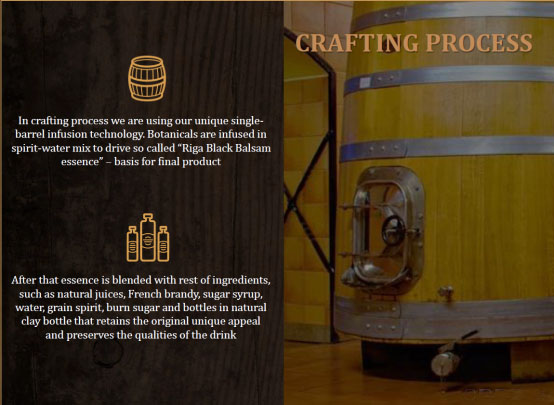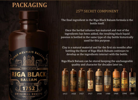 里加黑香脂酒配方的最后一種成分即是所選用的酒瓶本身。 植物浸液釀好后,加入剩余的成分,將濃烈甘醇的黑色液體裝入瓶中,正如這種粘土瓶自古以來都用來裝酒一樣。 粘土是一種天然材料,在裝入里加黑藥酒的前六個(gè)月內(nèi)由于與瓶體接觸反應(yīng),其口味仍在持續(xù)發(fā)酵中。 里加黑藥酒可以被數(shù)十年的存放,保持著品質(zhì)和特性的如一。
